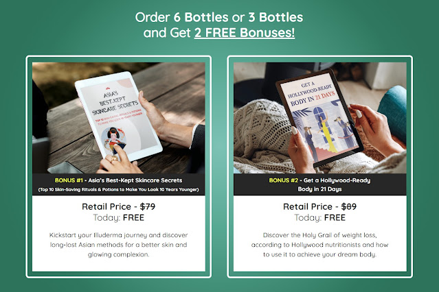 With every 3 and 6-bottle package of Illuderma skincare formula, you get two free bonuses. The details of these bonuses are listed below: